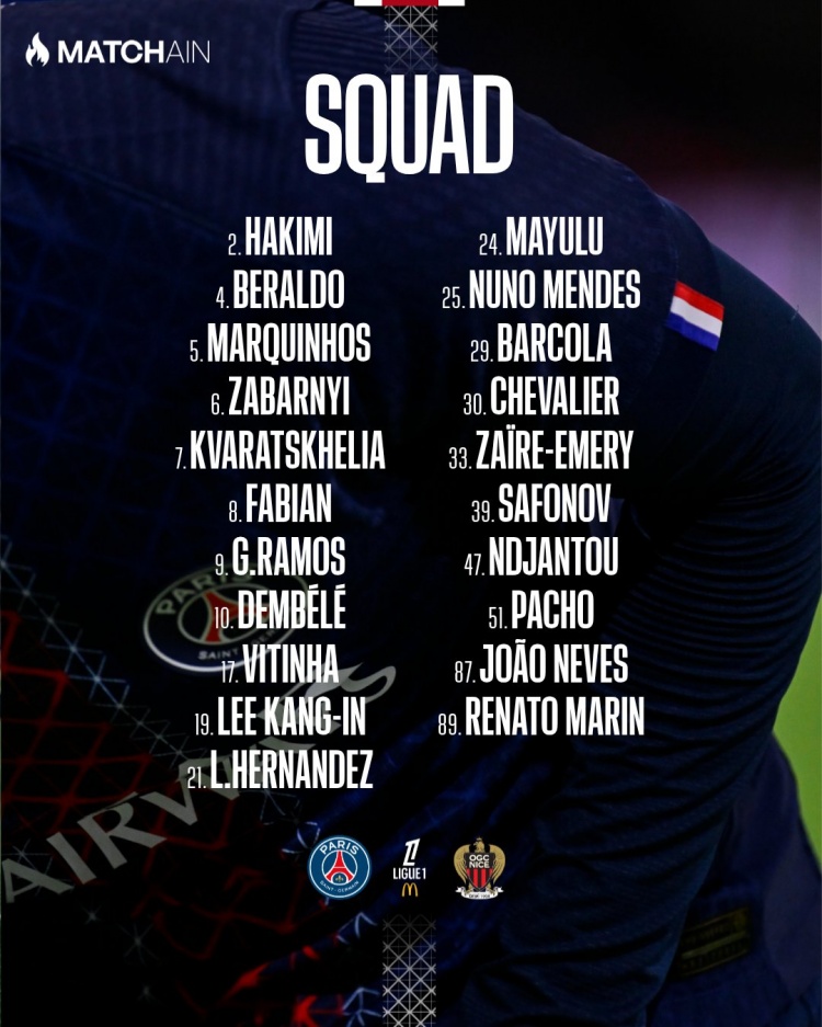 时尚:7-克瓦拉茨赫利亚、9-贡萨洛-拉莫斯、10-登贝莱、19-李刚仁、29-巴尔科拉、47-恩贾恩图