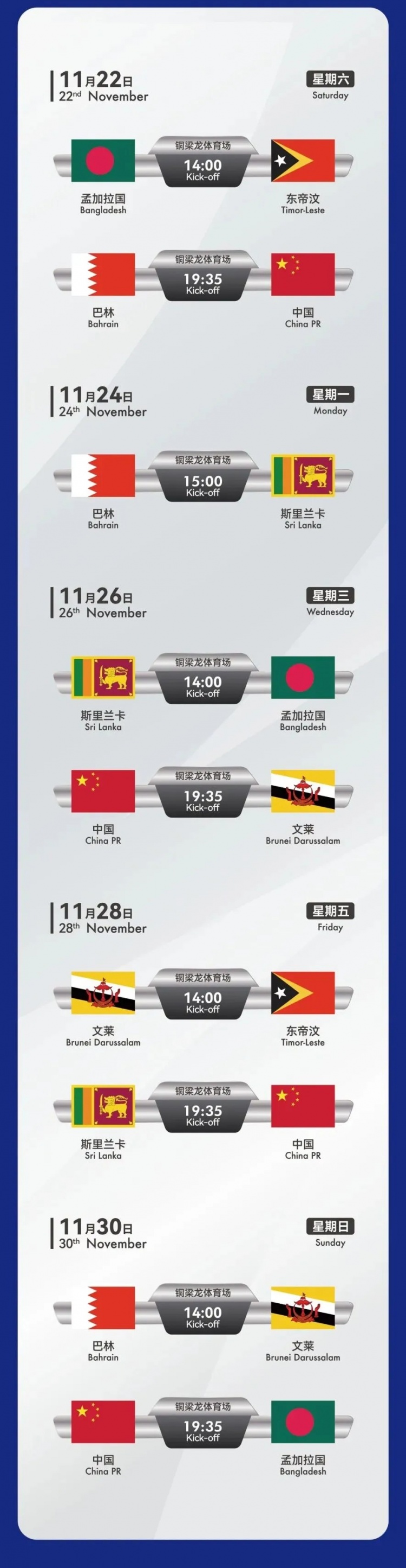 11月20日讯 国足U16将在11月22日-30日镇守铜梁龙指引场,迎战与巴林、东帝汶、文莱、斯里兰卡和孟加拉国同组,小组头名将径直晋级U17亚洲杯决赛圈。