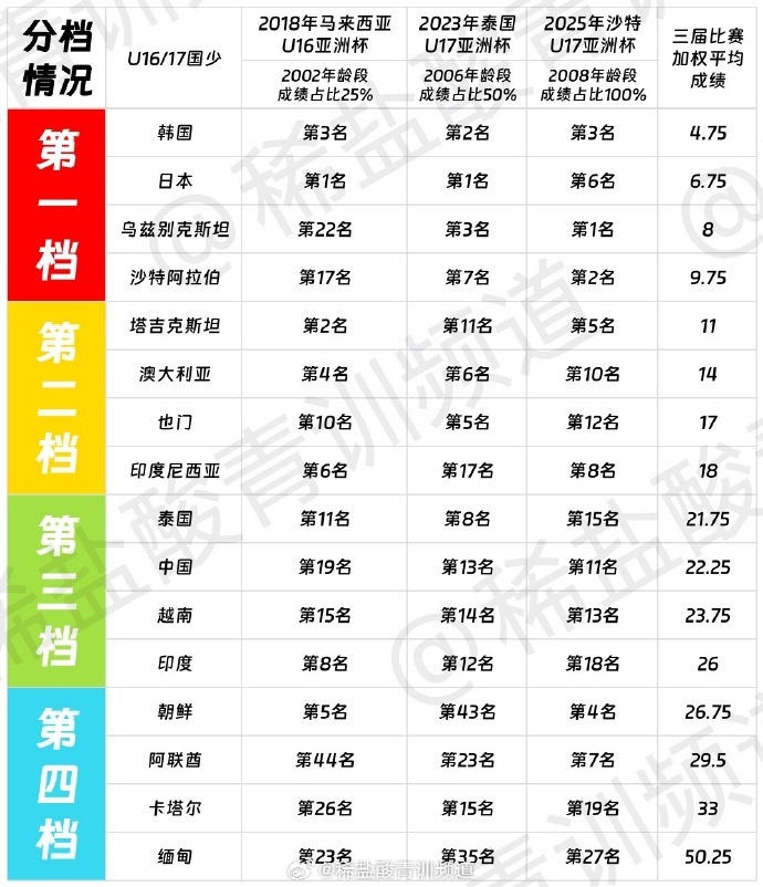 12月2日讯 博主“稀盐酸青训频谈”统计了2026年U17亚洲杯分档情况,中国U17排在第三层次。