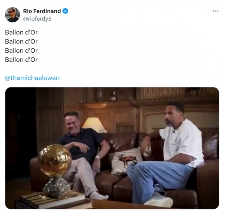 欧文接管费迪南德的采访,并展示我方赢得的2001年金球奖杯,费迪南德社媒晒出视频,配文:“金球、金球、金球、金球。”
