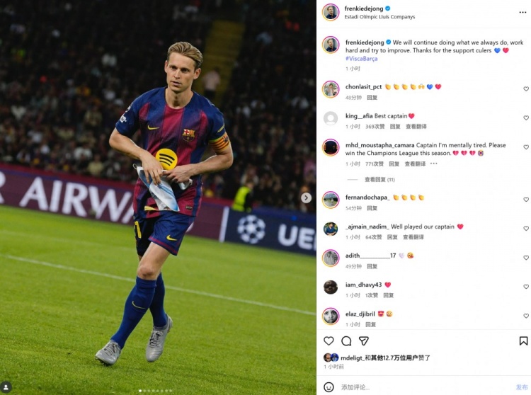 本场比赛德容算作队长首发出战,赛后他在社媒发文饱读动球队写谈:“咱们会持续坚抓一直以来作念的,致力锤真金不怕火并普及我方的发达,感谢巴萨球迷的维持!”