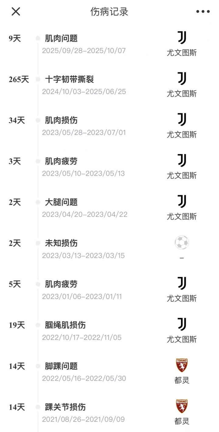 他在本年8月重返赛场,本赛季他为尤文出场5次,他上一次为球队出场是9月28日1-1战平亚特兰大的比赛。