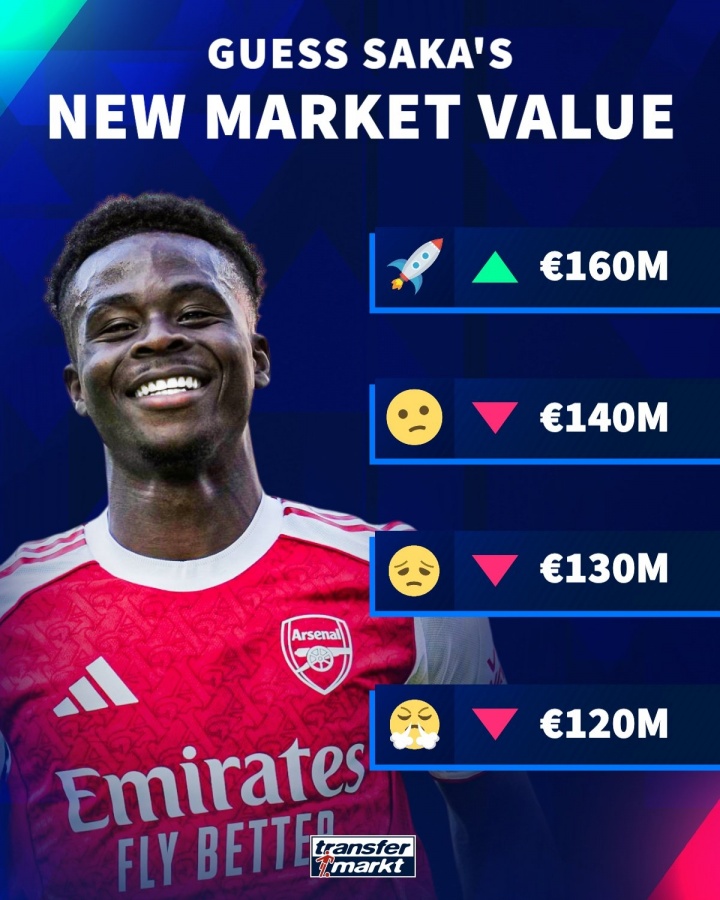 德转给出了萨卡身价变动的四个可能选项,差异是1.6亿欧、1.4亿欧、1.3亿欧和1.2亿欧。当今24岁的萨卡德回身价为1.5亿欧元,这也意味着本次萨卡的身价一定会迎来变化。