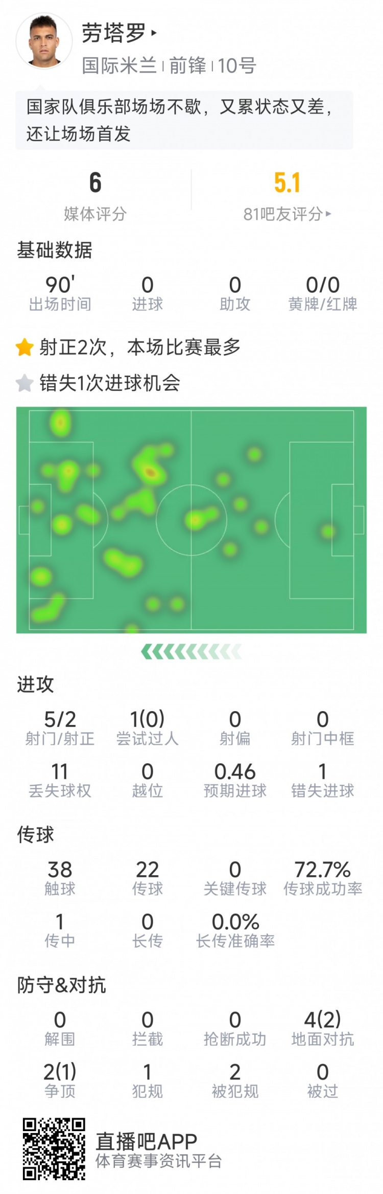 11月2日讯 在本轮意甲,国米2-1打败维罗纳。本场比赛劳塔罗首发登场打满全场,以下为他在本场数据: