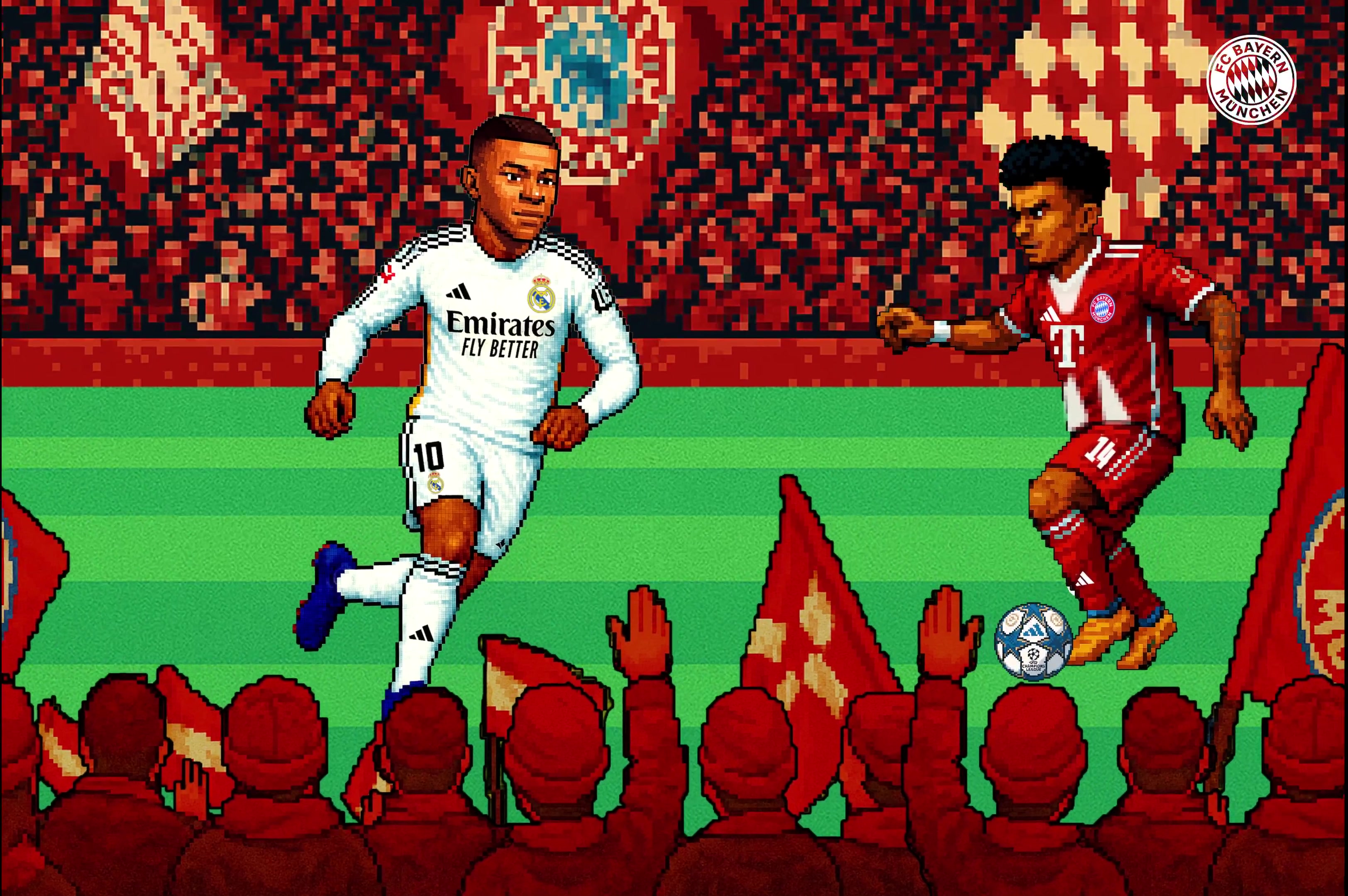 拜仁官方社媒晒出复古像素游戏风格视频,预热与皇马的这场对决。