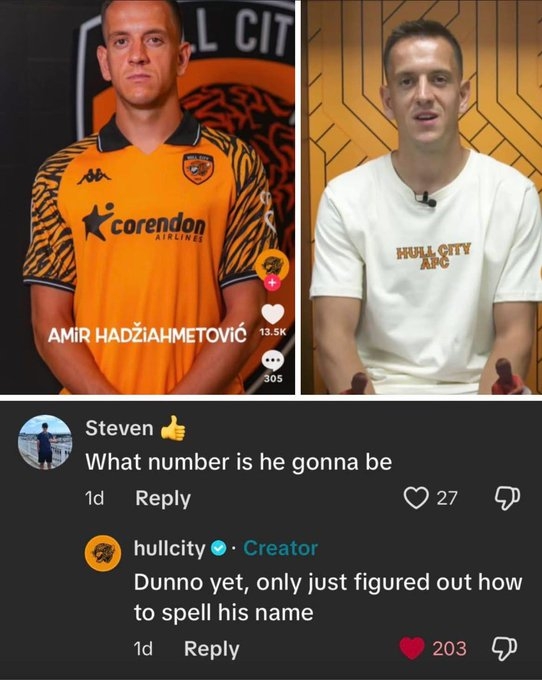 09月04日讯 前英超球队赫尔城官方在社媒上发布了一条音问,官宣签下新援哈扎赫梅托维奇(Hadžiahmetović)。但这位新援的名字似乎有点过于长了。