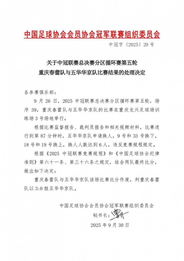 09月30日讯 中冠决赛阶段分组赛第5轮,重庆春蕾1-3不敌五华华京。中国足球协会会员协会冠军联赛组织委员会发布公告,由于五华华京队换东说念主东说念主数达到六东说念主,违背竞赛规程法律讲授,该场比赛五华华京被判0-3负。