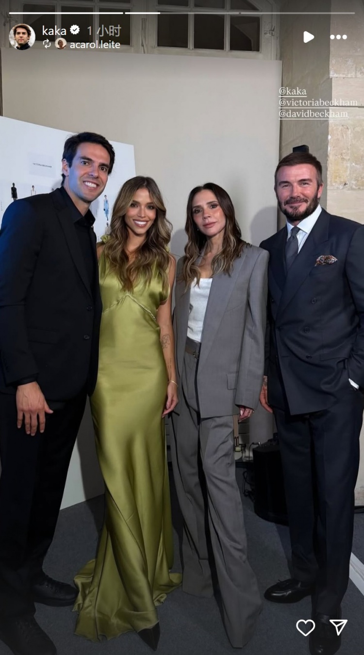卡卡、贝克汉姆携夫东谈主出席行径,卡卡社媒晒出四东谈主合照。