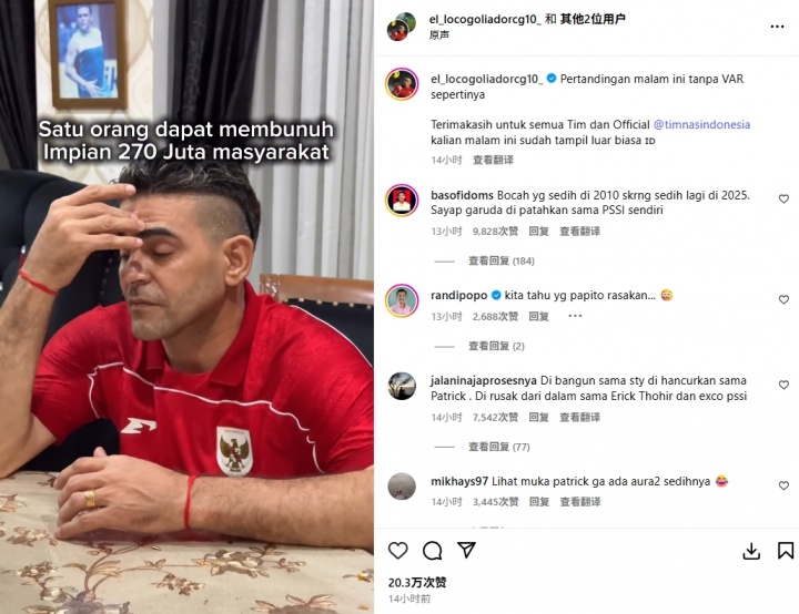 10月12日讯 世初赛亚洲区第四阶段B组第2轮,印尼0-1不敌伊拉克,照旧细则无缘2026寰宇杯。赛后前印尼国脚克里斯蒂安-冈萨雷斯在社媒发布视频,并品评了本场主裁马宁的弘扬。