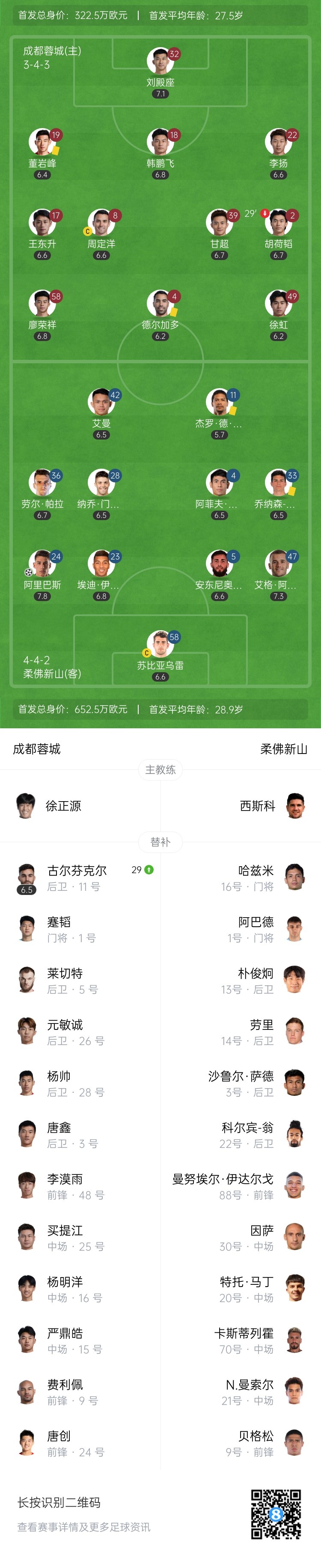 第27分钟,成皆蓉城前场纵情球,甘超主罚开到禁区内,李扬头球攻门顶偏了↓