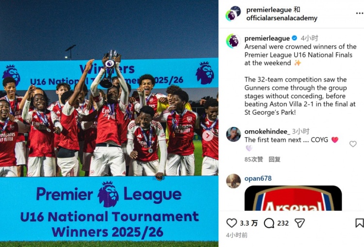 11月11日讯 英超官方文牍,阿森纳U16梯队在上周末问鼎英超U16天下锦标赛冠军。