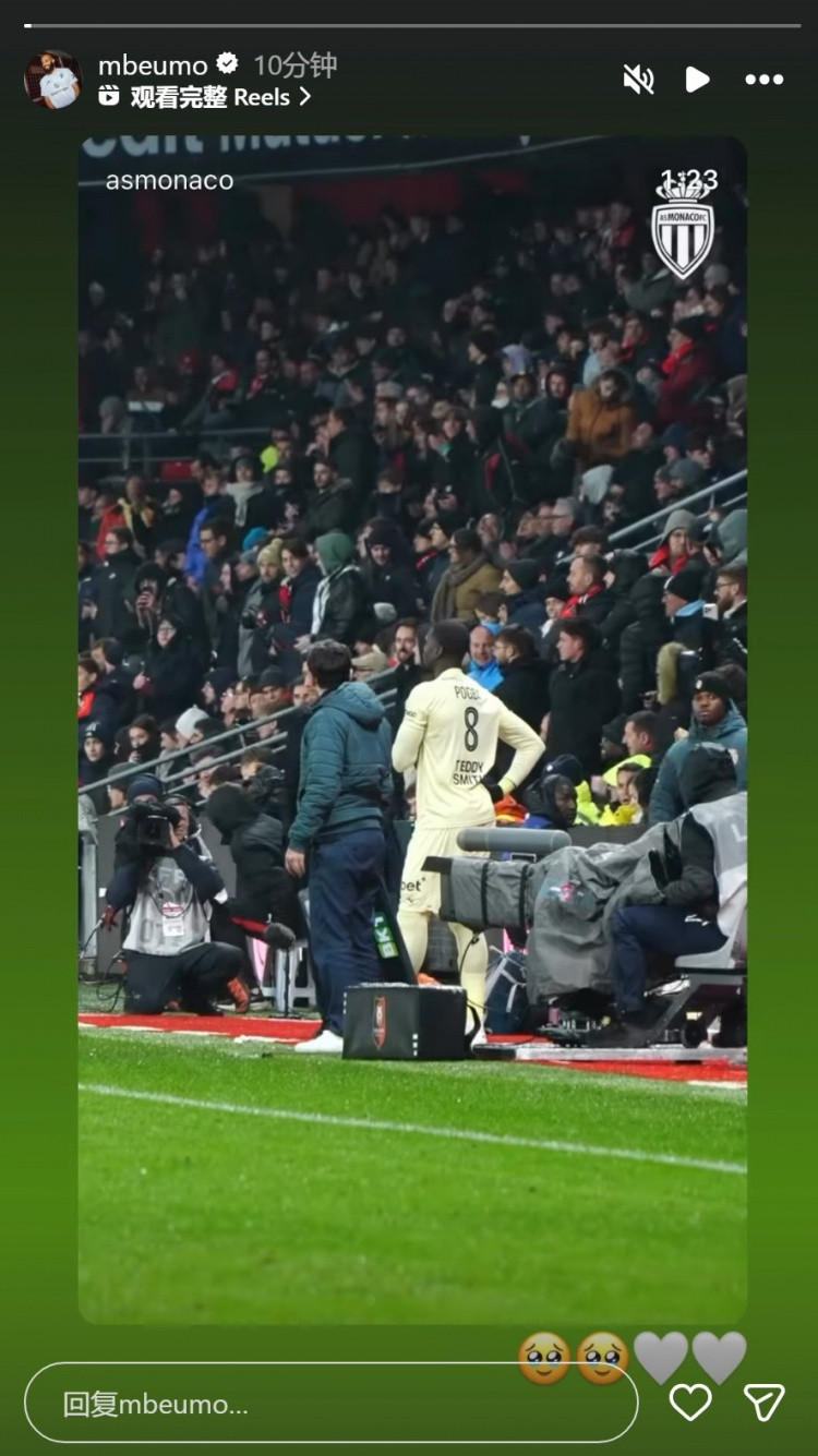 曼联时尚姆伯莫更新社媒动态,转发博格巴替补出场的视频,祝福他重返赛场。