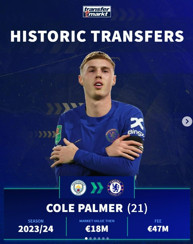 帕尔默23/24赛季曼城→切尔西,转会费4700万欧