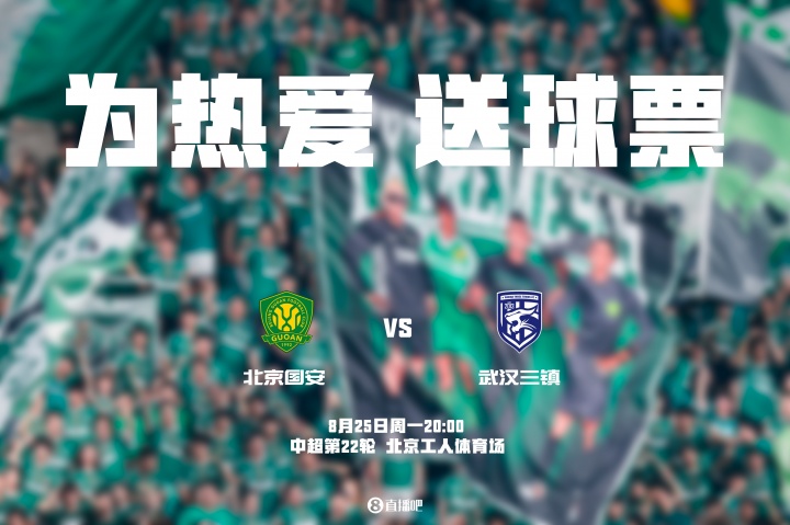 8月25日下周一20:00,中超第22轮北京国安镇守主场对阵武汉三镇,小吧络续为吧友带来球票福利!