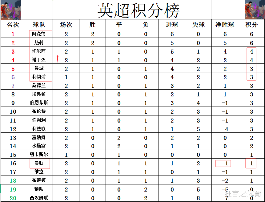 积分榜方面,阿森纳,热刺两连胜领跑,阿森纳一个净胜球位列榜首,热刺紧随自后,诺丁汉丛林1胜1平高出曼城,利物浦,净胜球弱势排在切尔西之后。曼联2轮不堪只拿到1分,排行从上轮的地15跌到第16。