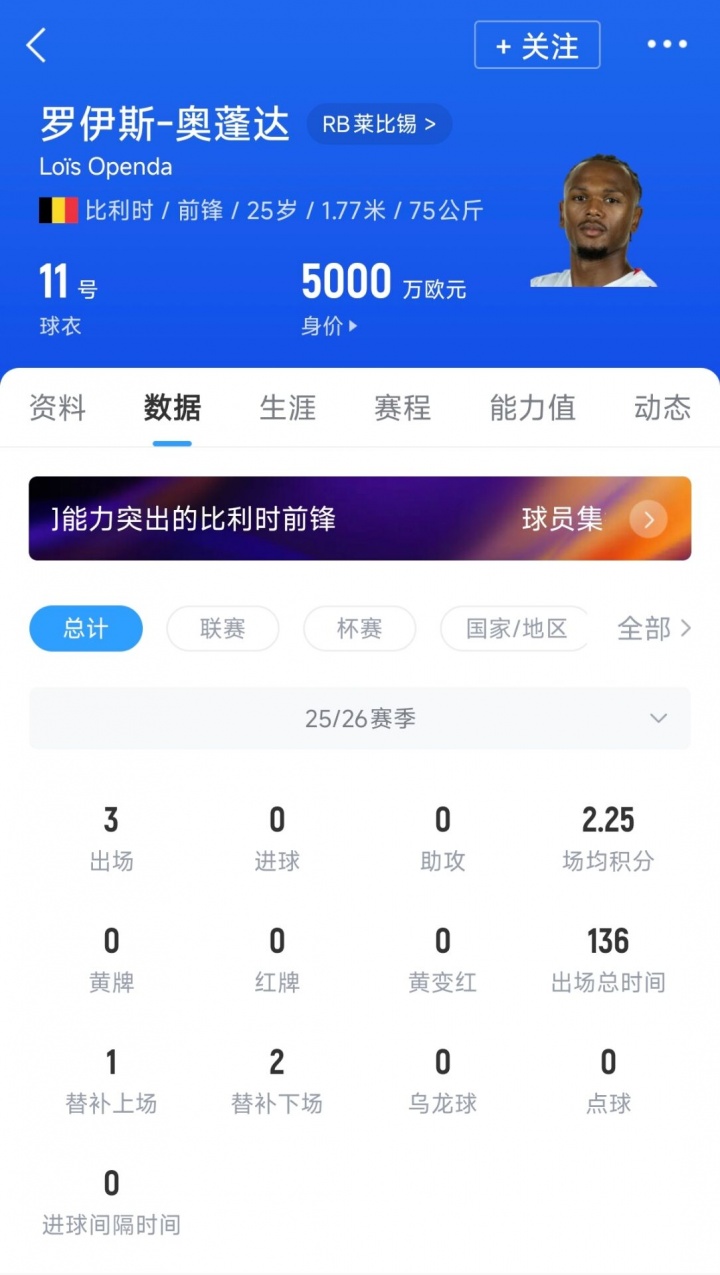 25岁的奥蓬达司职先锋,上赛季为莱比锡各项赛事45场13球7助攻,德回身价5000万欧元。