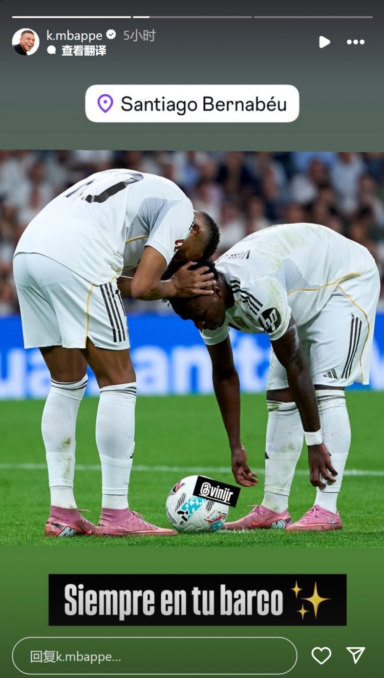 姆巴佩社媒晒出与维尼修斯的合照,配文:“永恒与你同在(永恒同德齐心)。”