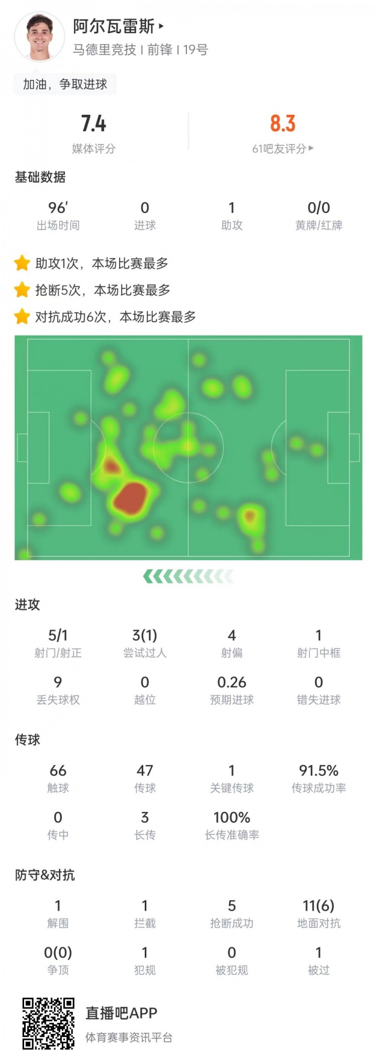 3月23日讯 西甲第29轮对抗赛,阿尔瓦雷斯踢满全局送出助攻分配球权入球数,马竞外场2-3不敌皇马。